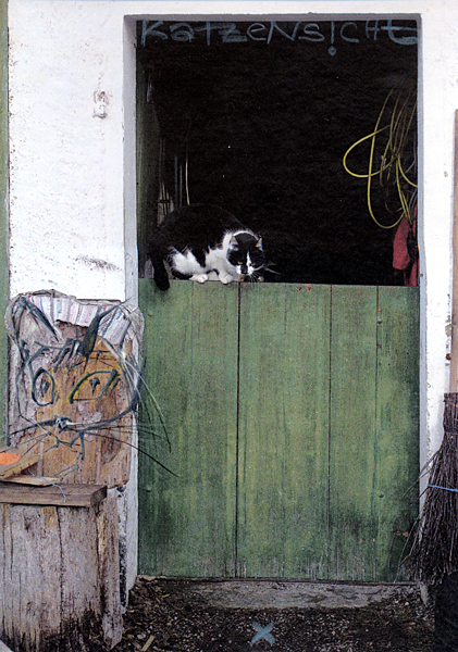 Was mir wichtig ist, sind die Katzen. In der Scheune leben elf wilde Katzen. Im Spalt unten sind welche. Schlecht zu sehen. Eine Schwarze, aber das hatten wir ja schon. Die Schwierigkeit, schwarze Katzen zu fotografieren. Die anderen neun kommen erst, wenn es Fressen gibt. Irgendwann habe ich alle Katzentiere unseres Dorfes dokumentarisch erfasst.