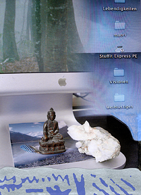 Der Computer, ich habe ihn lange unterschätzt. Jetzt ist er für mich sowas wie der Küstensaum zwischen Tonal und Nagual, alltäglicher- und nichtalltäglicher Wirklichkeit. Manchmal geht es ganz schnell hin und her. Und damit ich auf die Reisen über die Schwelle besser vorbereitet bin, habe ich mir ein paar Kräftigungsteile hingelegt – eine Eichelhäherfeder, die Lebensfreude, ein Bild von Belucha, einen Kristall aus dem Himalaya, den Luisa von dort mitgebracht hat. Er riecht nach Schneebergen, nach Erde, ganz eigenartig. Wenn ich Klarheit brauche, nehme ich ihn, rieche mich hinein, atme die kristallene Klarheit des Himalaya ein und lasse alles kommen. Er hat mir schon sehr viele Wege geöffnet und mich hoch fliegen lassen, um den ganzen Weg zu überblicken. Er passt sehr gut zur Computerschnelligkeit.