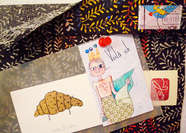 Sie kommen aus allen Richtungen, mit unterschiedlichen Gesichtern, die Überraschungen. Ein Brief von Julia, ihres Zeichens Künstlerin. Voilá ich, hat sie einmal geschrieben und sich gezeichnet. Der Brief ist stoffummäntelt und zugenäht. Ein gülden Gürteltier von ihr und seltsam zaubrische Worte enthält er. Eine Überraschung, die duftet, klingt, befühlt werden kann. Sinnenreiches, Wundersames.