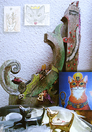 Sie ist eine Ritualkatze. Völlig strukturierter Alltag, der so eine Art Dauerritual ist, das wäre ihres. Sie liebt Altäre, sitzt gerne darauf und jetzt will sie einen für das, was ihr wichtig ist. Die baskischen Katzenahnen, Federn von großen Vögeln, vielleicht etwas Geweihähnliches. Und, damit wir beide nicht vergessen, dass sie eine Repräsentantin von Bastet ist, ein Bild von der Katzengöttin.