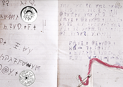 Ein Klassentreffen der Mädchen-Grundschule, zum ersten Mal. Was mache ich dort? Ein paar Entdeckungen, wie ein Geheimschriftenbüchlein, das meine alte Freundin mitbringt. Die Zeichen finde ich in meinen Bilder von heute wieder, der roten Faden. Da finde ich mich richtig gut.