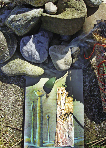 Ich nehme den Frühling und die Erneuerkraft und werde das Geisterbild begraben. Der Rauch von Artemisia und der helle Klang der Glocke begleiten das Anerkennen von etwas, das ich nicht bin. Neben dem kleinen Steinhaufen, einem Mini-Kurgan im Garten, mit Steinen aus aller Welt begrabe ich die Illusion in Grün.