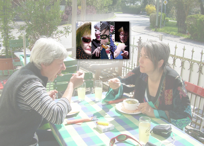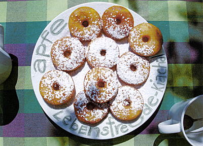Gela, Sabine, Inge und ich verleiben uns Lebensfreude-Apfe-Kiacherl ein.