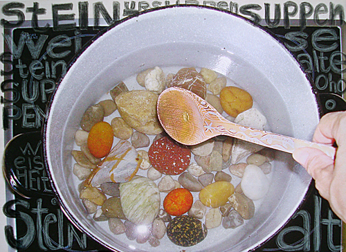 Brotsuppe, Blumensuppe, Totensuppe, Wurzelsuppe, Steinsuppe, mir manchmal ein Süppchen eingebrockt, mein Süppchen ausgelöffelt, Glückssuppe, Weinsuppe, Hochzeitssuppe … Kraftspeise, Gemeinschaftsmahl.