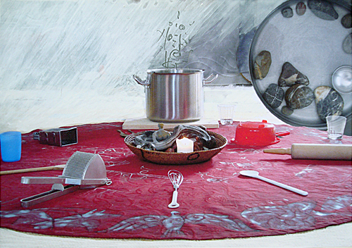 Magische Werkzeuge am heiligen Feuer. Eine Steinsuppe ist dabei. Jede bringt einen Stein, gemeinsam kochen wir die Suppe, verleiben uns die Weisheit aller ein und gehen, gescheiter als zuvor wieder heim, weil wir ja die Weisheit mit Löffeln gegessen haben.