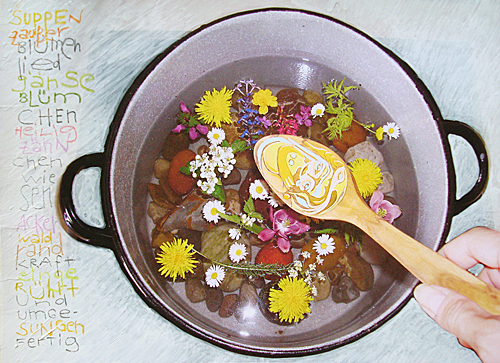 Ich liebe Suppen und mache mir eine Frühlingssuppe mit Blumen und Kräutern, mit der ganzen Erneuerungskraft, mit Lebenskraft und bunter Vielfalt, mit Gelb und Sonnenschein und einer Grüngeschichte. Feuer und Wasser eingeladen, ein Lied reingesungen und mit dem Zauberstab umgerührt.