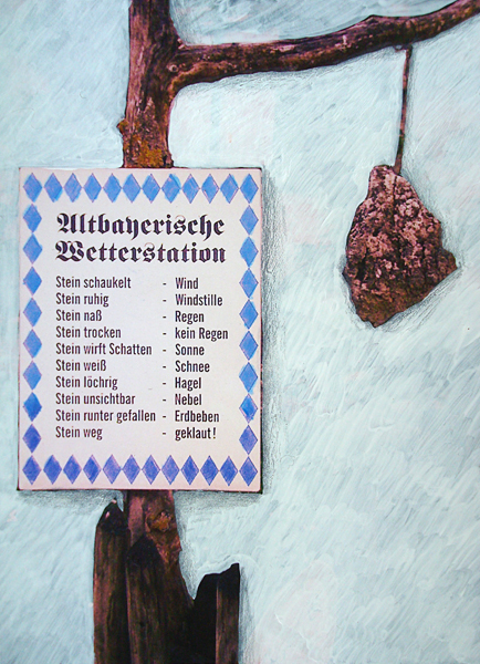 Im Zuge der Verwetterung will ich das Wetter genauer beobachten. Ohne das ist es in vielen Teilen der Erde nicht möglich zu überleben. Frühlingsstürme, Hagel, plötzlich aufziehende Nebel – die bayrische Mildnis fordert mir nicht allzu viel ab. Weil ich dieses Jahr Flüsse, Seen und Berge erkunden will, brauche ich eine gewisse Sicherheit in Wetterkunde. Eine altbayrische Wetterstation unterstützt mein Vorhaben. Einen Stein, eine Schnur und den wissenschaftlichen Textteil immer dabei.