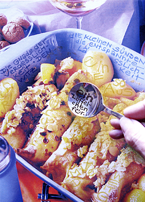 Ein Löffelchen für den klaren Blick und den sicheren Griff, eins für den guten Biss und ein weiteres für den beherzten Schritt. Eins, zwei, drei Löffelchen für die kleinen blauen Wunder. Ein Löffelchen dafür, dass ich nicht alles wissen muss und noch eins für ein entspanntes Verhältnis zu Schnecken. Eins für meine Lebenskraft und ein Löffelchen für meine Leidenschaft zum Kuriosen. Ein großes Löffelchen für den kleinen Pickel am Kinn, eins für den Schmarrn und das letzte für die Erfinderin des Löffels.