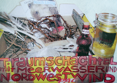Der Postbote bringt mir manchmal ganz Aussergewöhnliches. Eine Schachtel zum Träumen und Spielen mit Fundstücken von der Nordsee zum Beispiel. Es ist eine Überraschungsschachtel mit Steinen, Federn, Strandgut, zwei Flaschen – die eine mit Meerwasser und die andere mit Nordostwind. Der hohe Norden weht und spielt sich jetzt hier in meinen Südgarten.