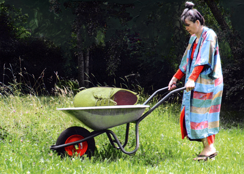 Das Gewand und die Arbeit. Neues ausprobieren, Grenzverwischungen an den festen Trennlinien von Alltags- und Arbeitsgewand und dem Besondersgewand, der Ritualkleidung, dem Sonntagskleid und was es da alles gibt. Was verändert sich, wenn ich im Prachtgewand abspüle, im Ritualgewand sense oder in der Kittelschürze ins Theater gehe?