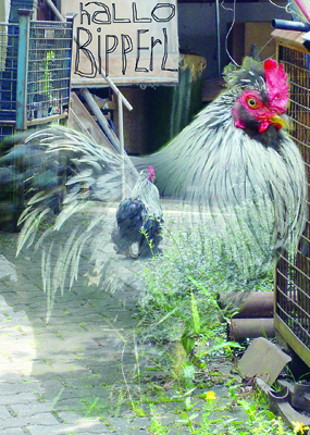 Und dieses Jahr, in der Blumenschule, da habe ich einen Hahn kennengelernt, den Bipperl. Es ist nicht vergleichbar mit den Raben und doch ist es sowas wie ein kleiner Sommerflirt. Er gefällt mir schon sehr und es macht mir Freude, ihm das mitzuteilen und ihn zwischendurch anzuflirten. Der Bipperl hat eine hinreißende Stimme und ist schon ein ganz Schöner.