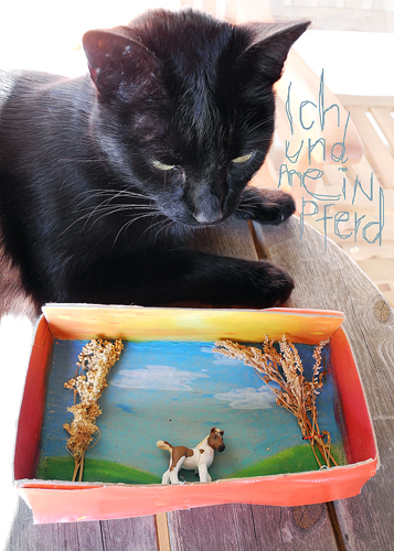 Hallo Du, ich schreibe heute für dich, wie es mir geht und so. Also naja, zum Glück ist Tante Olga Maria hier. Sie ist meine Katzennanny. Froh bin ich, dass sie nicht gehen kann, dann bleibt sie bei mir. Ich werde mich auf sie drauflegen, dann kann sie zusätzlich nicht weg. Besser so. Mein Pferd ist auch da, es ist ein Geschenk und ich hüte es. So ein schwarz-weißes Pferd wollte ich immer schon.