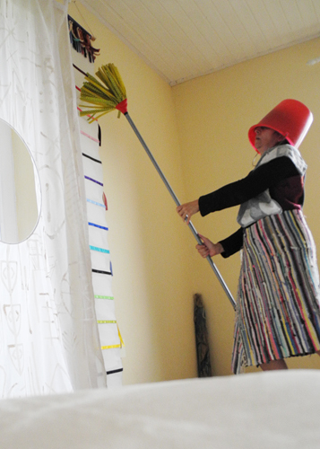 Heute verwerte ich alte, zu klein gewordene Teile, die ich besonders mochte und mache aus mehreren ein neues Kleid. Flickenhaft und asymmetrisch wird es, weil ich von keinem Stoff genug habe. Also wieder ein Kunstteil. Vielleicht wird es das rituelle Staubsaugergewand oder eines, das ich gerne mit dem Redestab in Verbindung bringe. Im Laufe der Zeit wird es seine Qualität schon zeigen. Da ich nicht nach Schnitten nähen kann und auch keine Knopflöcher, verengt sich mein Repertoire etwas. Ich mache Freihandschnitte vor dem Spiegel und entwerfe Modelle, die mit Zierknöpfen auskommen. Dem Energetischen nimmt das nichts. Stoffe, die kein Umnähen erfordern, liebe ich besonders. Statt Innenfutter gibt es Innenbemalungen und Rocksaumgeschichten.