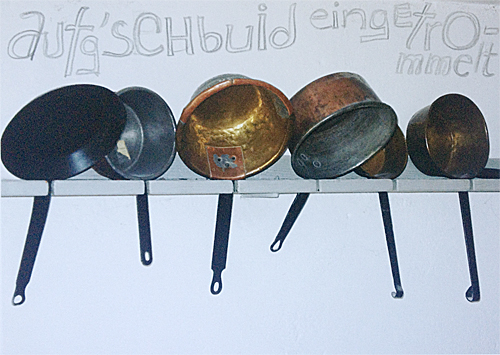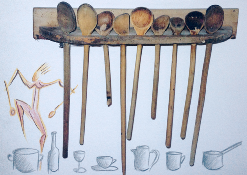 Beim Abstauben und Einsortieren der Küchenschränke klimpert es, Kochtopf an Pfanne, ein Löffel fällt runter, Teller auf Holz. Auf einmal höre ich die Geräusche anders, pling pling, tok und es ist ein Rhythmus. Drei Gläser hingestellt, die Töne ausprobiert, zwei Töpfe dazu, verschiedene Schlägel ausprobiert. Die Kochlöffel mag ich am liebsten. Ich spiele den Jankadi und den Buru, dann Fantasiezeug, die Stimme kommt dazu, es lässt sich auch tanzen. Im Drehen nehme ich neue Instrumente dazu wie den Tisch, die Türklinke und die Ofenleiste vorne. Im wilden Trommeln zerdeppere ich fast die schon angesprungene Teetasse und frage sie, ob sie keine Lust mehr hat zu bleiben. Sie verabschiedet sich. Kleine Percussionschäden können auftreten. Die Küche ist wie ausgefegt, erfrischt und gut bespielt.