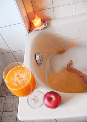 Das Badewasser färbe ich orange oder rot, Kerzen und ein Lied in Orange und dann trinke ich noch ein orangerotes Getränk dazu. Campari würde sich anbieten oder Karottensaft, wahlweise bei mir auch Hagebuttentee, weil sie zu den Wurzelfrüchten meines Lebens gehören.