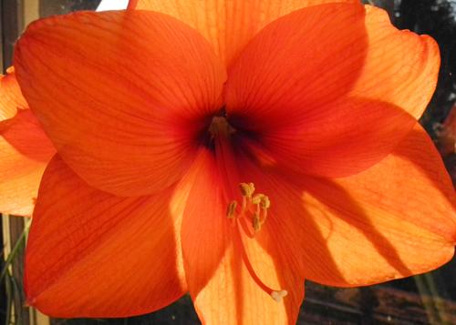 Die große, rote Blüte bringt mich darauf, wie schön es ist, durchlässig zu sein für Licht- und Schattenspiele – gleichermaßen. Wenn alles in alle Richtungen durch die Häute scheint, nichts mehr anhaftet, dann könnte es sehr leicht werden. Wie zart und dünn und kräftig die Blütenblätter sind.