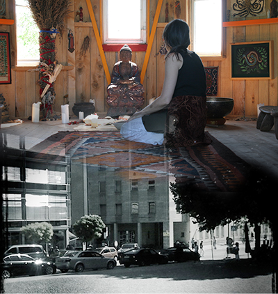 Mit meinem Radierpinsel im Photoshop bekomme ich die weichen Übergänge schon ganz gut hin. Ob das ein Medizinweg ist? Wenn die schwierigen Übergänge in die scheinbaren Unheiligpassen kommen, an den Computer gehen und rumradieren, überblenden, ineinanderkopieren? Ich habe mir eine größere Tasche gekauft, da könnte ich ein Medizinset aus Radiergummi, Verflüssigungsgel, Schere, wasserlösliche Aquarellstifte und sonstige geeignete Übergangswerkzeuge reintun.