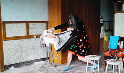 Bewegungstempi ändern, Gesänge zu den Räumen finden, laut vor mich hinsingen, was ich lese und nebenbei mein Kleid bügeln. Wie ein absurder Traum ist es, in den die Leute kurz reinschauen und alles ganz normal finden. Das finde ich besonders.