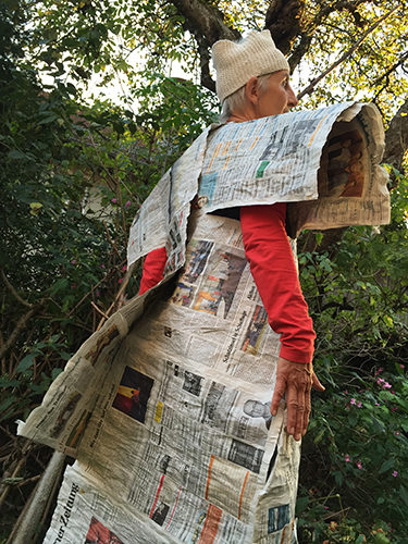 Wir wissen nicht wirklich, was wir tun. Abfallkleider, Papierkleider aus Zeitungen, Tapeten, vielleicht Plastiktüten kreieren. Eingewanden. Zur Ausstellungseröffnung im Januar wollen wir etwas machen. Talken (engl.). Den Schrättlis unsere Stimmen leihen. Irgend sowas. Inga will viereckig sein. Mea kommt ein bisschen priesterlich daher bei der Anprobe. Und ich habe im Herbstdurcheinander noch gar keine Idee. Das Programm geht in Druck, es muss was rein und später dann kannst du deinem Text folgen – „Performativer Schrättl-Talk“. Vielleicht passt es dann gar nicht mehr und im Januar ist uns nach Schweigen. Weil Schweigen die Botschaft der Stunde ist. Und dann? Dann sagen wir :“Das war ein Schmarrn mit dem Schrättl-Talk.“ Oder, dass das ein von langer Hand geplanter Überraschungscoup ist. Wir könnten das Schweigen als was viel Gereifteres verkaufen. Es müsste uns was einfallen.