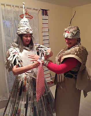 Inga, Mea und ich arbeiten an den Papiergewändern. Manches will überhaupt nicht gelingen, schaut völlig blöd aus oder scheint die ultimative Lösung zu sein und beim ersten Einkleiden löst es sich auf. Wir haben nicht gelernt, wie man aus Zeitungen Röcke macht, das ist Neuland.