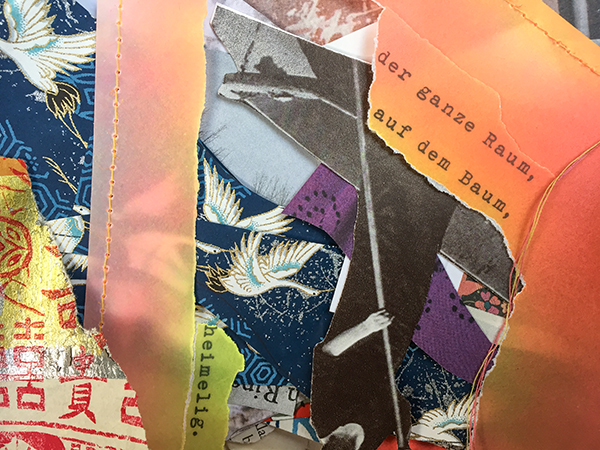 Das alleine ist es ja nicht, das machen viele. Und es kann sehr schön aussehen. Was aber, wenn nicht. Da höre ich „Schee is wos anders.“ (Schön ist was anderes.) Der rote Faden ist auch so ein Qualitätskriterium. Was, wenn es den nicht gibt. Keinen – scheinbar – roten Faden, nicht in der Arbeit, nicht im Leben. Da werden die Winde kühler. Der rote Faden im Unzusammenhängenden. Es arbeitet in mir, ich tanze in die Felder des Unperfekten. Am Material scheitern, schludern, die Fadensuche aufgegeben. Entspannung ist auch was anderes.