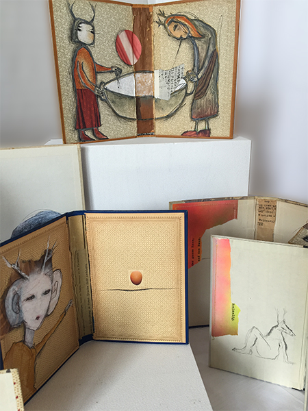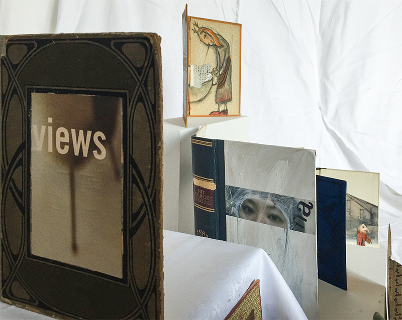 Manchmal mache ich schamanische Reisen, um mir ganz konkrete Arbeitsanleitungen geben zu lassen. Die letzte Anleitung war, in Scheunenflohmärkte zu gehen, alte Bücher zu suchen, sie zu entleeren und neu zu befüllen. Mit Schnipseln, Zeitschriftenfitzeln, drüberkrikseln. Einen Durchlauf, dann wieder was anderes machen. Nur nicht irgendwo einrichten. Es scheint wichtig zu sein im Moment, im Spielen und Experimentieren zu bleiben. No-Project. Kaum habe ich den roten Faden, ist der Durchlauf vorbei. Es sollten 13 Bücher sein, die Närrinzahl. Zu Hause beim Zählen waren es dann 15. Es zerschießt mir gerade jedes Konzept. 15 ist so gar keine besondere Zahl und ich will sie mir auch nicht schönreden. Bei den Schrättli-Postkarten hat es mir die 13 auch schon zerlegt, es sind aus Versehen 14 geworden. Auch da, kein Bedeutsamreden.
