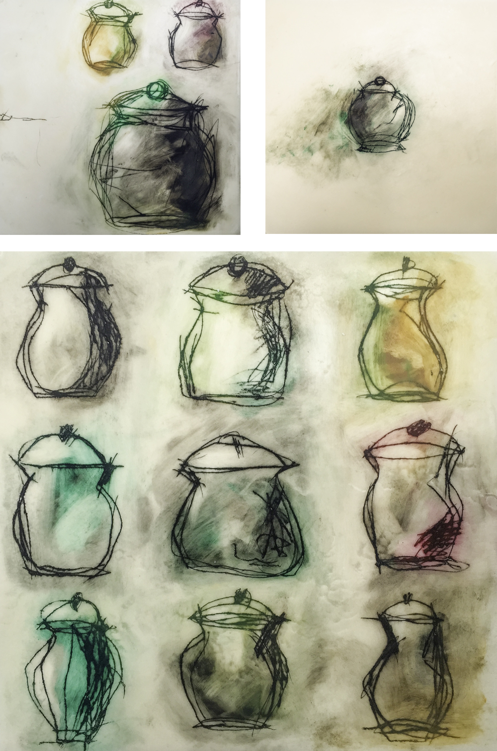 Ich portraitiere sie, auch das festigt unsere Beziehung. Die schnelle Skizze eignet sich gut dafür. Manchmal haben sie was von Poltergeistern, wenn ihnen fad ist und ich habe wenig Lust auf ihre Streiche. Dann wieder feiern sie Partys mit andersartigen Artefaktegeistern. Da geht die Post ab. Ich habe eine alte Trommel aus Tibet, eine Damaru, ein Schmuckteil und eine Schere von meiner Großmutter, Leinen, Kochlöffel, Töpfe, Geschirr und Gartengerät, das über hundert Jahre alt ist. Antiquitätenhändlerin wollte ich nicht sein und in einer Art Geisterhaus arbeiten oder wohnen. Das wären dann zu viel an Geistern und Geschichten und ich müsste dauernd mit ihnen tanzen und Portraits machen. Die Muße musst du ja erstmal haben.