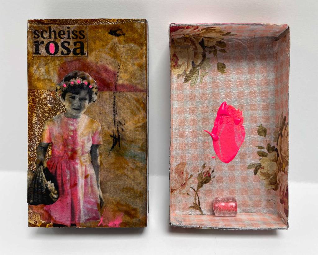 Meine Aussöhnung mit Rosarot. Ein altes Foto von mir, eine Streichholzschachtel, Erinnerungen an Lieblingsfarben oder eben nicht, rumschmieren und der Transformationsprozess beginnt.
