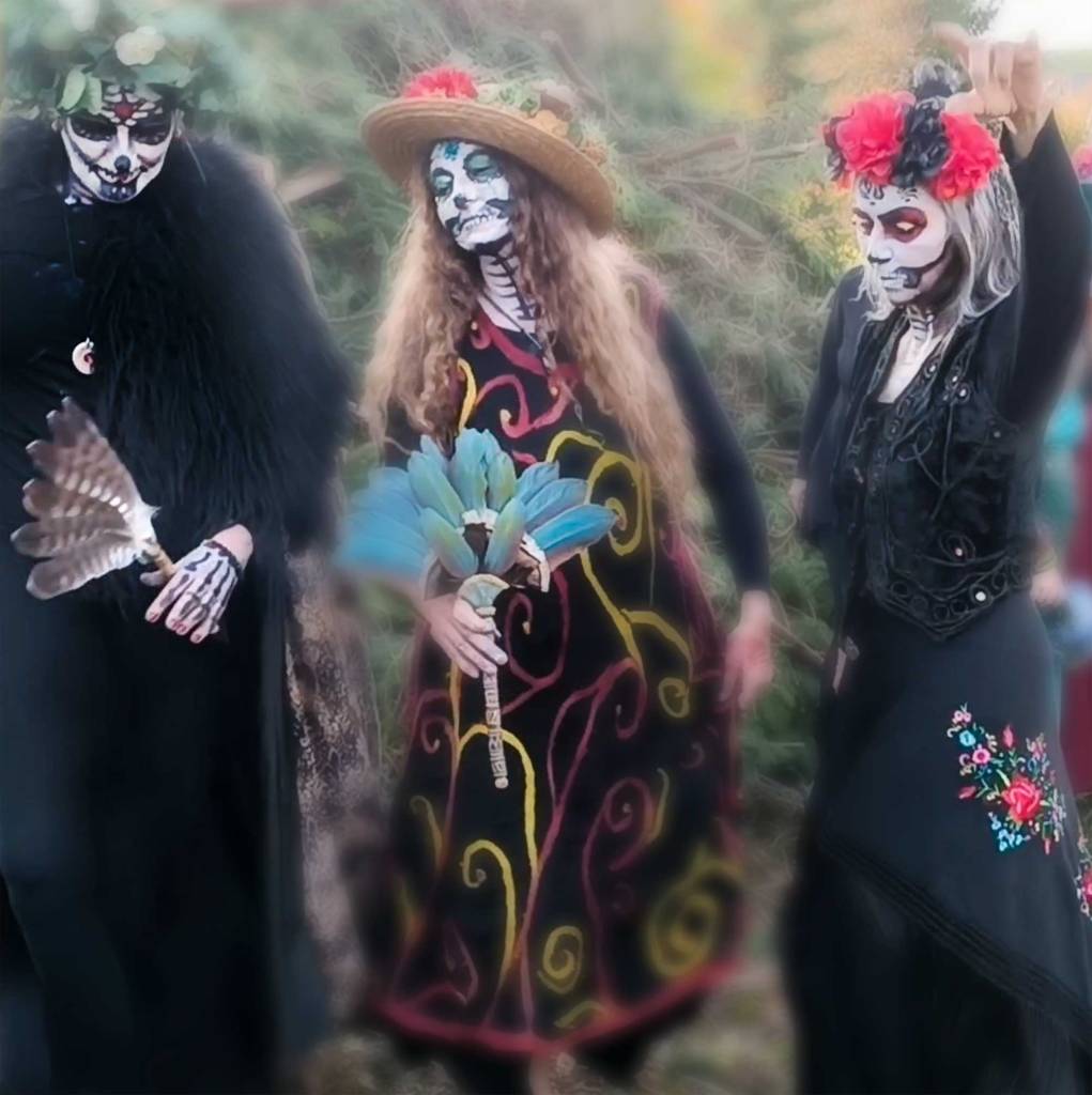 Ein Knochentanz in die dunkle Zeit hinein. Die Schleier zu anderen Welten, zum Ahnenfeld sind dünn. Inspiriert von den großen, freudigen Festen in Mexiko zum Ahnenfest, haben wir uns getroffen. Neun Frauen und unzählige Ahnen, die zusammen gefeiert haben. Mit Bemalung und Geschichtenaustausch, mit dem Weg zum Ursprung, mit Speis und Trank und als Sterbeammen für das alte Häuschen im Dorf, das der Ort vieler Tänze und Fotosessions mit Anke und mir war.