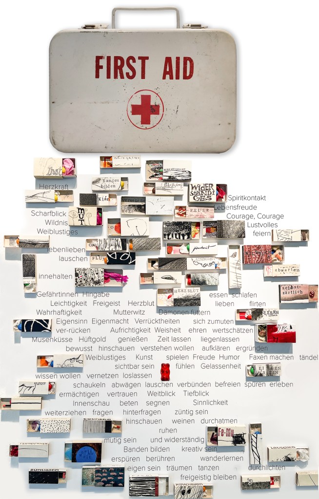 Ich sammle und nichts ist mir zu klein, um es nicht auszuprobieren und zu ehren. Alles, was hilft ist gut – um in die Kraft zu kommen, um in der Kraft zu bleiben, für die Lebensenergie, das Vertrauen, die Zuversicht, für gute Nahrung auf allen Ebenen. Ich sammle alles, wovon ich denke, dass es heilsam und segensreich ist. Manchmal stärkt es allein schon, die Wörter zu sagen, zu singen und die vielen Medizinschachteln zu befühlen. Ich habe es wie bei Adventskalendern gemacht, in jeder ist ein buntes Schoki-Teil und ich esse sie bei Bedarf.