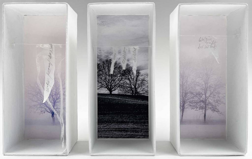 In der laufenden Ausstellung im frauenmuseum wiesbaden – essential areas – habe ich ihnen einen eigenen Bereich gegeben. Es gibt „Himmelszitate“ von Marina Abramovic, die an der Decke sind. Im Bereich der Fragen ist es dieses:
