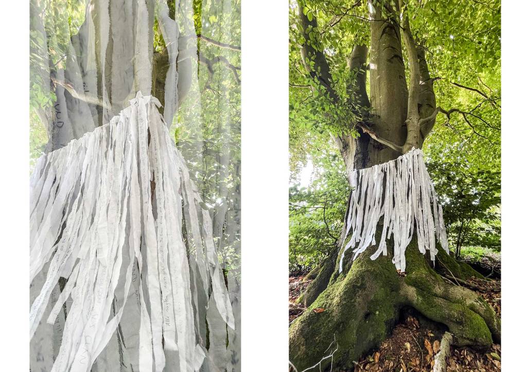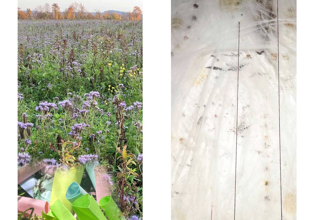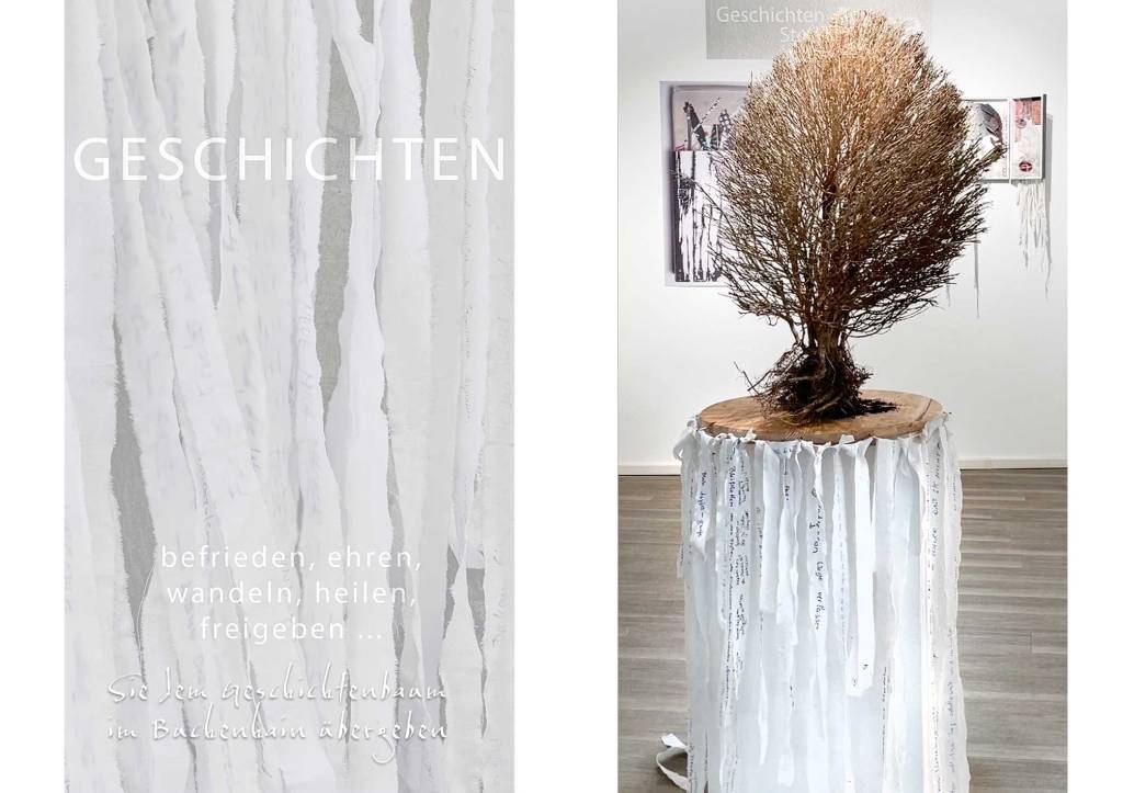 Die Zeit der Ausstellung im frauen museum wiesbaden ist vorbei und ich merke, was für eine Kraft und Schönheit es hat, die Kunst hinauszutragen – ins Leben, in die Wälder, aufs Feld. Dorthin, wo es sich auf ganz natürliche Weise wandeln kann, wo Regen und Sturm und Vögel und Katzen mitwirken, wo Füchse an den Samenzetteln riechen und der Wind die Asche mitnimmt. Wo nachts die Rehe all die Geschichtenbänder beäugen und die Eulen mit ihrem Flügelschlag einen Bewegungshauch hineingeben.