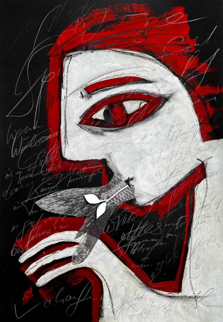 Dann neue Farben ins Spiel bringen. Lachsfarbene Kräfte, Silberfäden, Neonpunktneuigkeiten dazu. Aussortieren, übermalen.
