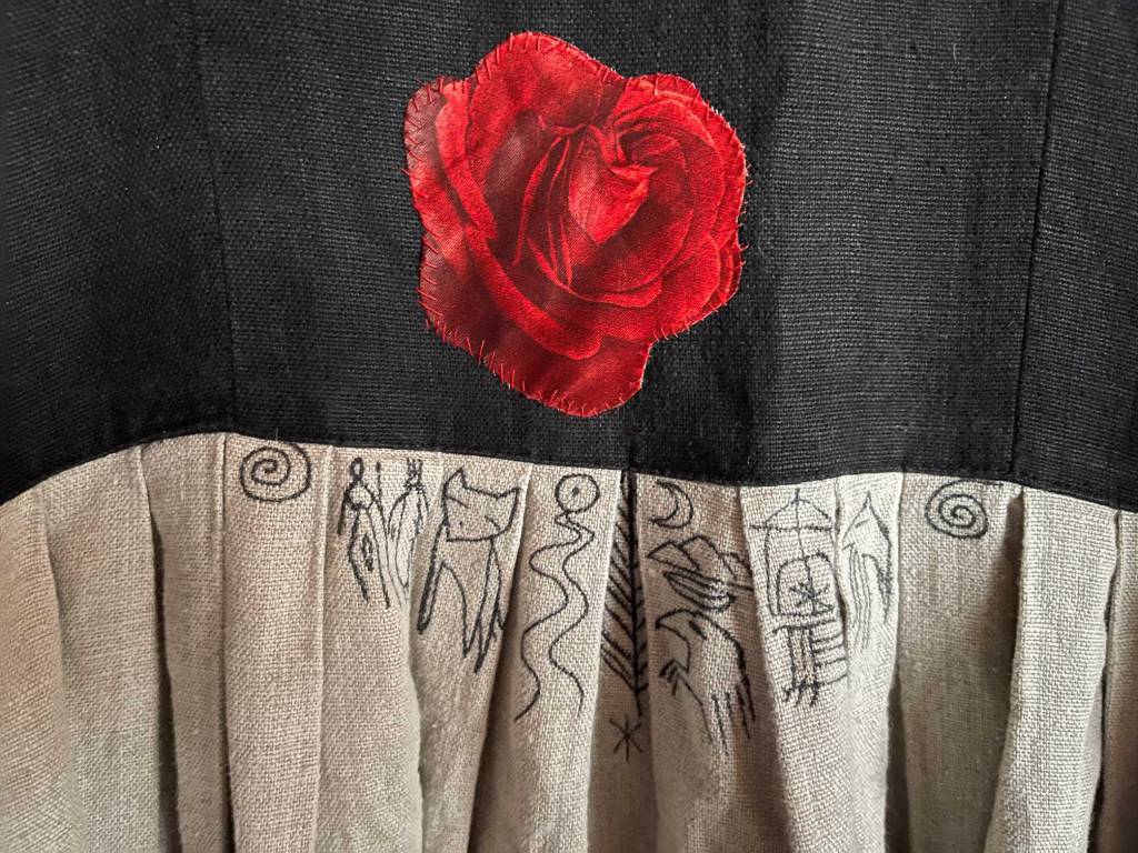 Um dem Geschehen dieser Zeit besser zu begegnen, rufe ich die Blumenkriegerin. Für ihre Kraft nähe ich mir eine Rose aufs Gewand und zeichne meine Verbündeten auf den Stoff. Die Närrin ist auch dabei, weil sie mit Chaos und Destabilisierung am besten umgehen kann.